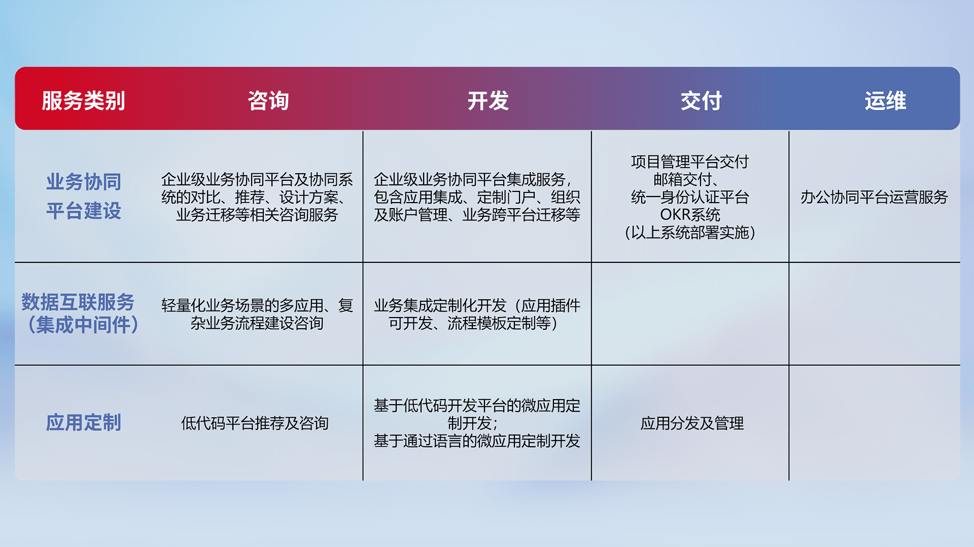 针对钉钉、、、、企微、、IDaas等平台级产品提供产品的规划、、方案、、交付、、、定制化开发等服务,,,实现如统一协同办公、、、、智能客户服务、、混合会议管理、、智能数据查询、、等业务场景,,实现数字化转型。。