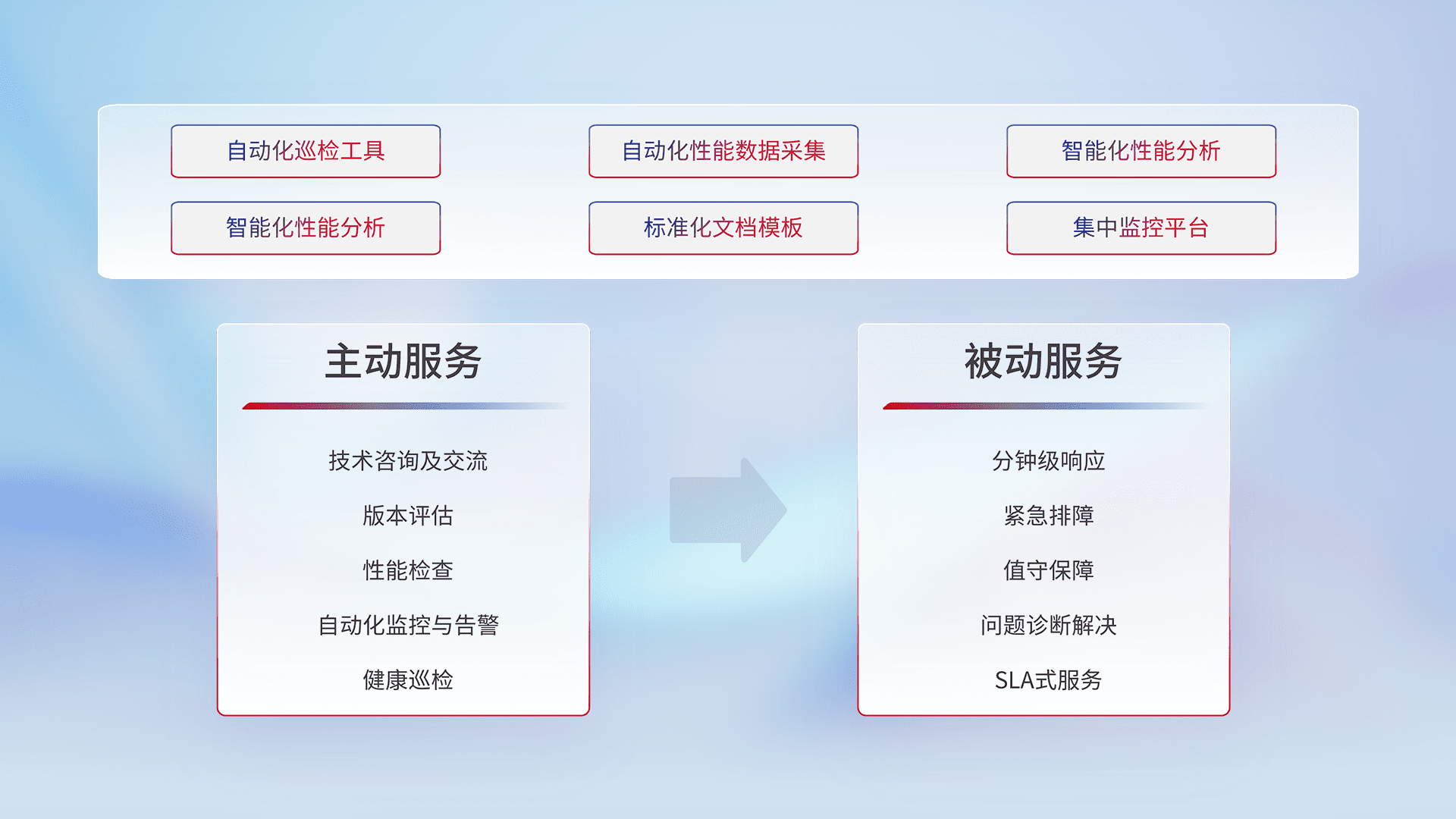 智能化工具和标准化文档,,保障服务质量,,,,提供主动服务(包含技术咨询、、版本评估、、性能检查、、自动化监控与告警、、健康巡检)和被动服务包含(分钟级响应、、紧急排障、、、、值守保障、、问题诊断解决、、SLA服务)。。